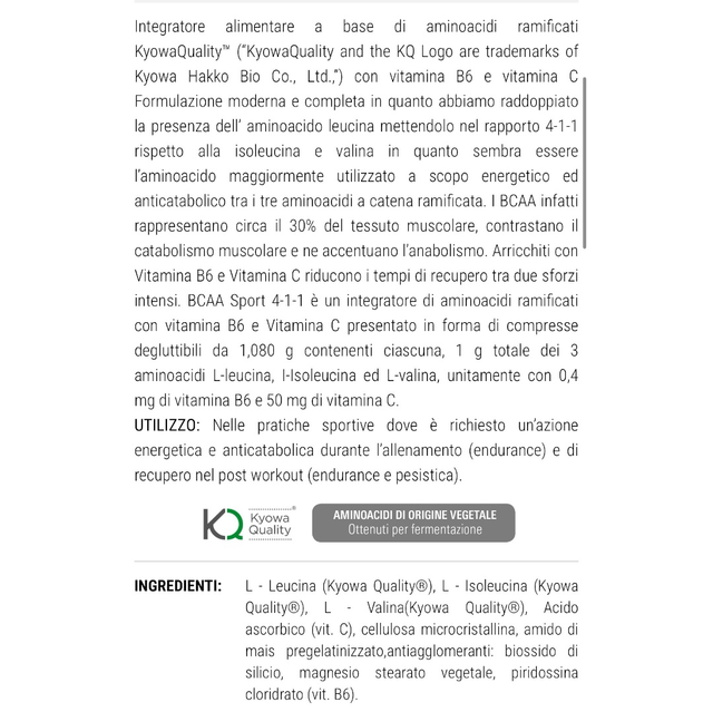 Pre/intra/post workout contrasta stanchezza favorisce il recuperio. BCAA 4.1.1 di origine vegetale Kiowa Quality con l'aggiunta di vitamine C e B