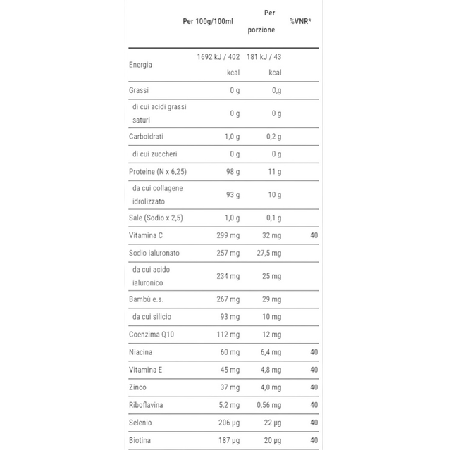 Integratore alimentare di collagene idrolizzato, sodio ialuronato, coenzima Q10, vitamine e minerali.