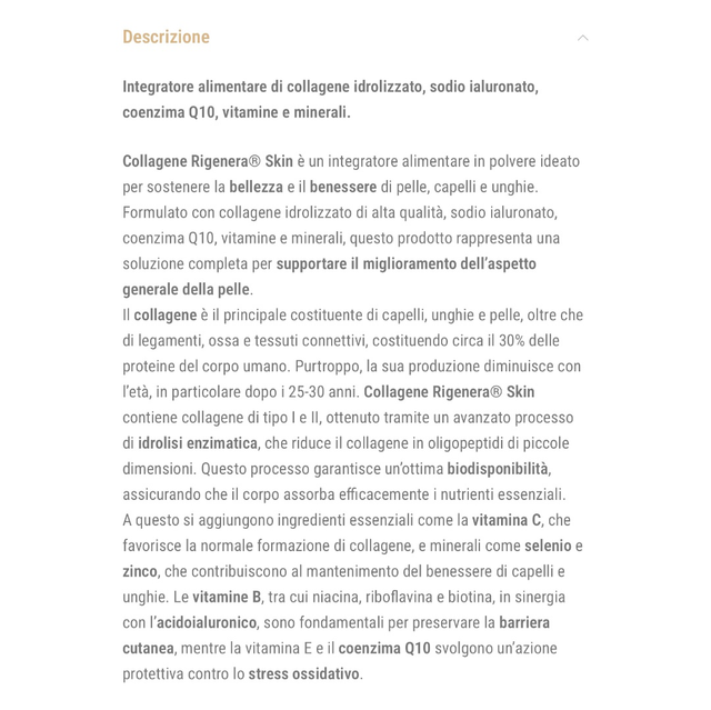 Collagene Rigenera® Skin è un integratore alimentare in polvere ideato per sostenere la bellezza e il benessere di pelle, capelli e unghie. Formulato con collagene idrolizzato di alta qualità, sodio ialuronato, coenzima Q10, vitamine e minerali, questo prodotto rappresenta una soluzione completa per supportare il miglioramento dell’aspetto generale della pelle.