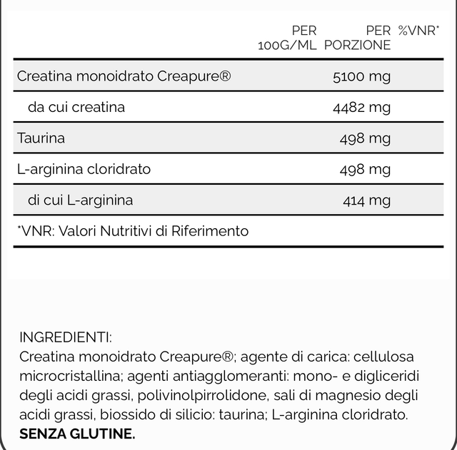 Creatina Platinum combina la potenza della creatina con taurina e arginina per offrire una carica di energia muscolare potenziata. La creatina aumenta la forza e la potenza muscolare, migliorando anche la resistenza durante gli allenamenti intensi. La taurinasupporta il recupero muscolare, riducendo l’affaticamento muscolare e accelerando il recupero dopo l’attività fisica. L’arginina favorisce il flusso sanguigno e la vasodilatazione, migliorando l’apporto di nutrienti e ossigeno ai muscoli durante l’esercizio.