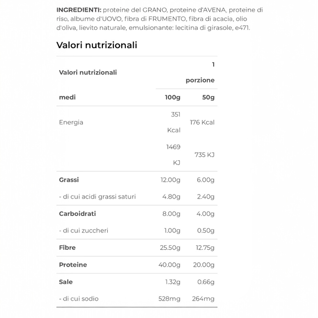 INGREDIENTI: proteine del GRANO, proteine d'AVENA, proteine di riso, albume d'UOVO, fibra di FRUMENTO, fibra di acacia, olio d'oliva, lievito naturale, emulsionante: lecitina di girasole, e47